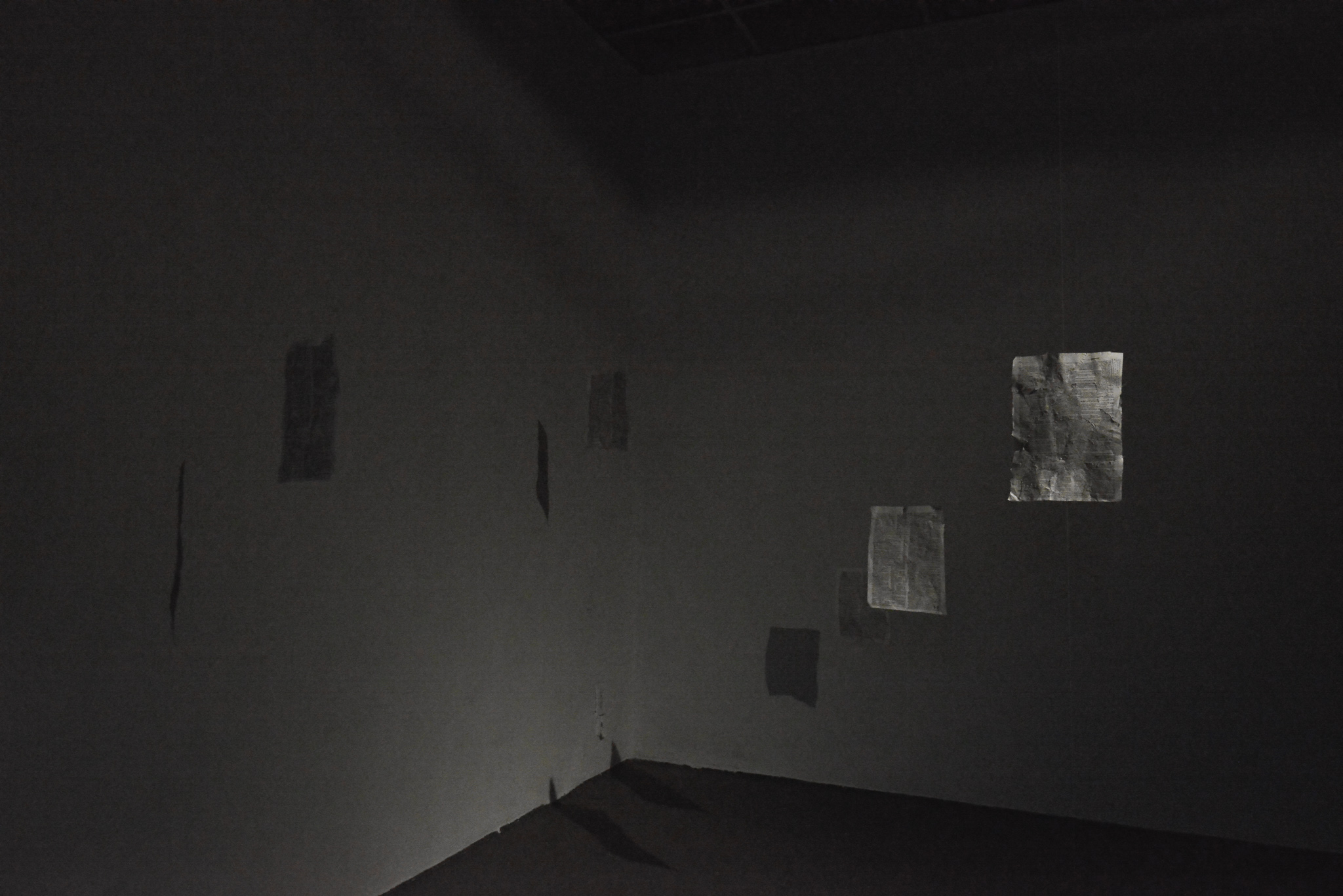 bookbinding gauze, dictionary shreds, fishing wire, video projection loop