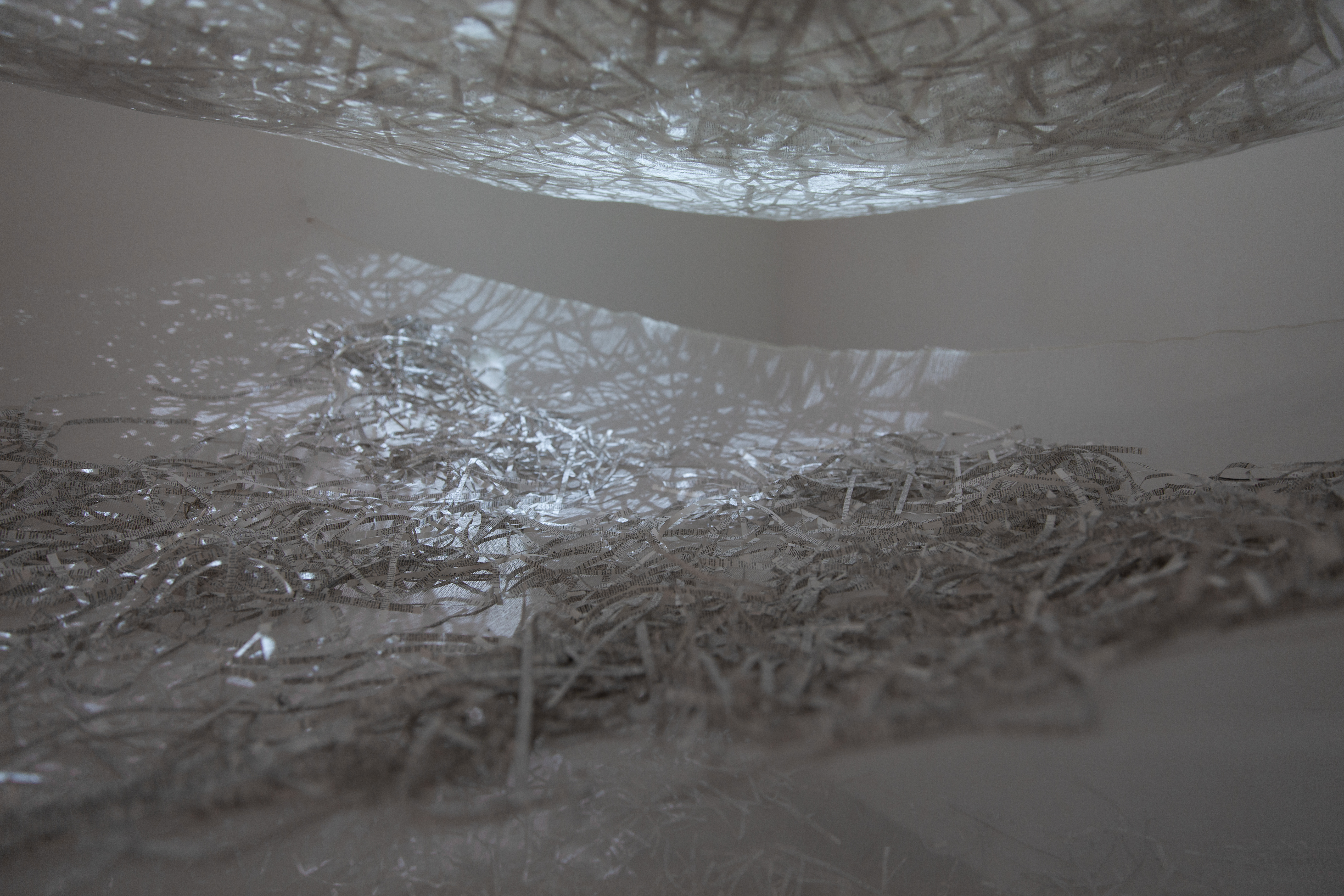 "Deep down shallow water" is an installation work that employs bookbinding gauze, shredded dictionary parts and video. The installation consists of five layers of bookbinding gauze, each with shredded dictionary parts accumulated on them. The projection light features a video of snowflakes drifting away, gradually descending from the top to the bottom layer of the gauze. The accompanying sound component resembles that of a damp basement or cave.