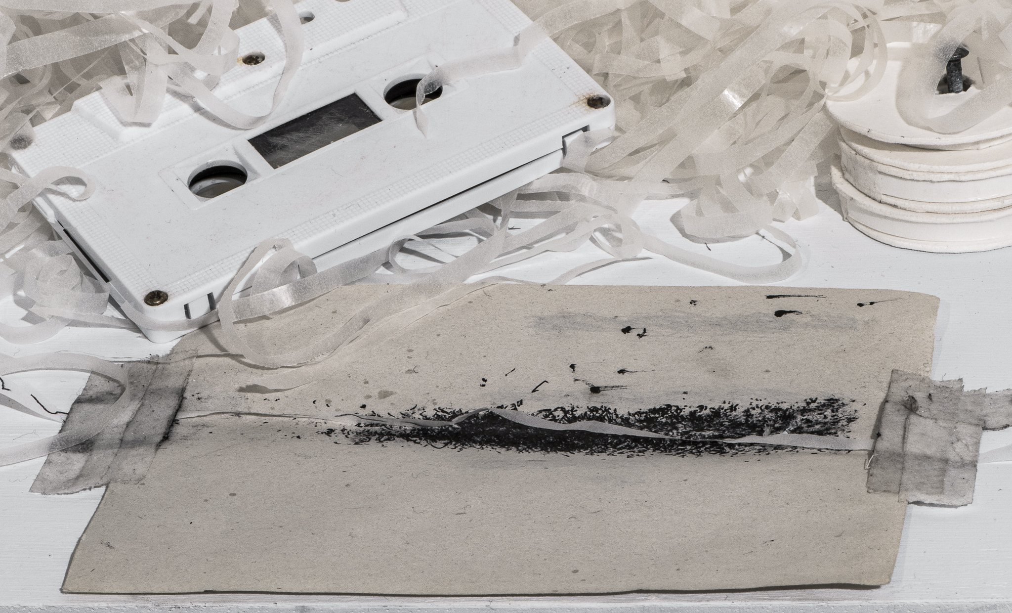 The fabricated empty cassette tapes are filled with illegible, stretched words relate to the title of the work, muted, implies vaguely recalled memories and also paradoxically shows how memories are beautified and stored differently.