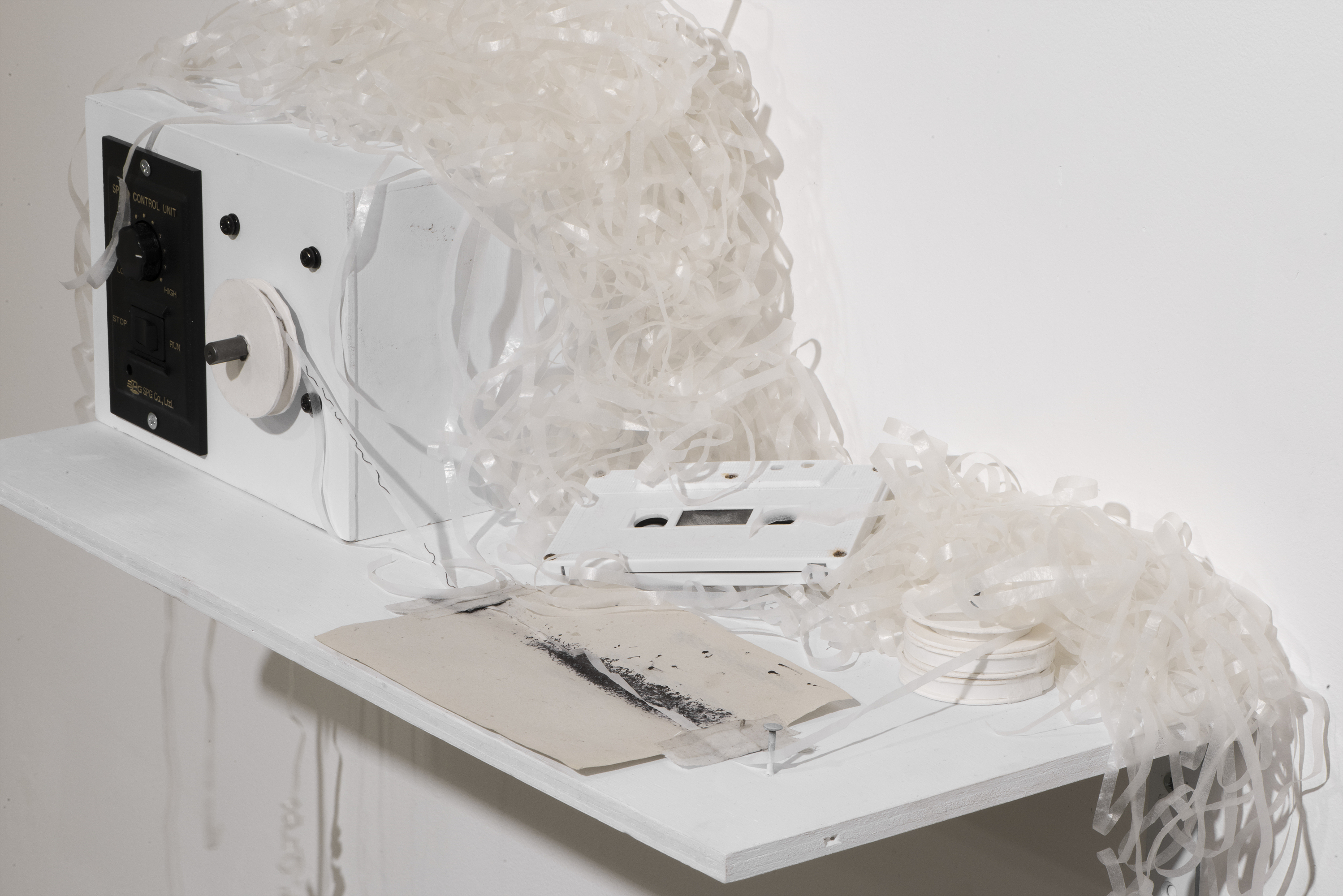 The motor device in the work resembles the mechanism of the cassette tape player. The tape reel is replaced with shreds of translucent paper rolls. While the motor’s power is on, attemptting to write letters-memories-on the reel of the tape would turn out illegible since the paper keep moves in one direction.